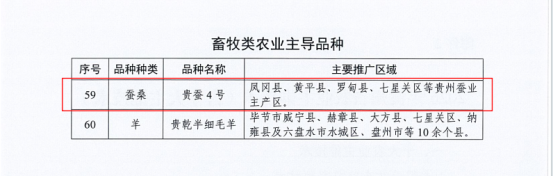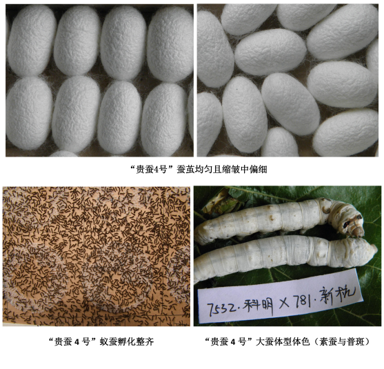 贵蚕4号【黔审蚕2012001号】:二化四眠、春秋兼用家蚕四元杂交种。茧白色、长椭圆、缩皱中等。春蚕全茧量2.08g、茧层率23.74%;秋蚕1.88g、茧层率23.33%。平均茧丝长1195米,解舒率85.3%,出丝率44.38%,洁净/清洁度双100分,纤度3.2D,春季平均张种产茧量51.88㎏,秋季平均49.46㎏。主要推广区域为凤冈县、黄平县、罗甸县、七星关区等贵州蚕业主产区。