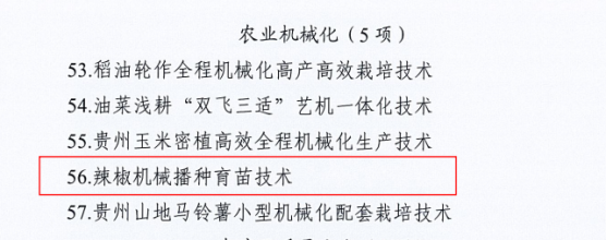 辣椒机械播种育苗技术:辣椒作为贵州特色经济作物之一,产业发展基础好,在辣椒播种育苗环节,采用半自动化机械播种育苗可提高效益4~5倍,全自动机械播种可提高效益10倍以上,大大减少育苗环节的用工成本,有效缓解辣椒产业发展面临劳动力成本投入过高,椒农种植效益偏低等突出问题。